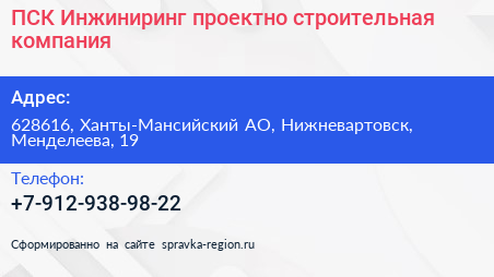 ПСК Инжиниринг, проектно-строительная компания по адресу 628616, Ханты-Мансийский АО, Нижневартовск, Менделеева, 19 в дальнейшем Организация, размещена в следующих категориях: