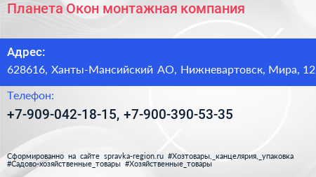 Планета Oкон, монтажная компания по адресу 628616, Ханты-Мансийский АО, Нижневартовск, Мира, 12 в дальнейшем Организация, размещена в следующих категориях: