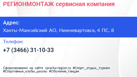 РЕГИОНМОНТАЖ, сервисная компания по адресу Ханты-Мансийский АО, Нижневартовск, 4 ПС, 8 в дальнейшем Организация, размещена в следующих категориях: