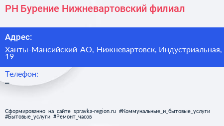 РН-Бурение, Нижневартовский филиал по адресу Ханты-Мансийский АО, Нижневартовск, Индустриальная, 19 в дальнейшем Организация, размещена в следующих категориях: