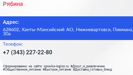 Рябина по адресу 628602, Ханты-Мансийский АО, Нижневартовск, Пикмана, 30а в дальнейшем Организация, размещена в следующих категориях: