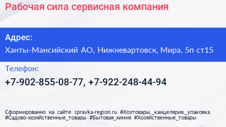 Рабочая сила, сервисная компания по адресу Ханты-Мансийский АО, Нижневартовск, Мира, 5п ст15 в дальнейшем Организация, размещена в следующих категориях: