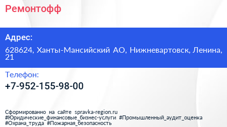 Ремонтофф по адресу 628624, Ханты-Мансийский АО, Нижневартовск, Ленина, 21 в дальнейшем Организация, размещена в следующих категориях: