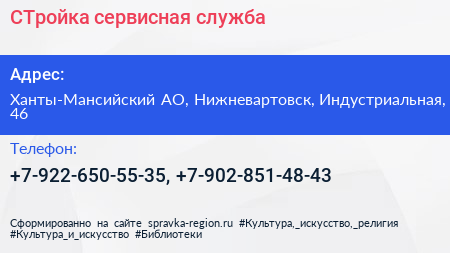 СТройка, сервисная служба по адресу Ханты-Мансийский АО, Нижневартовск, Индустриальная, 46 в дальнейшем Организация, размещена в следующих категориях: