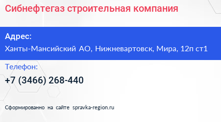 Сибнефтегаз, строительная компания по адресу Ханты-Мансийский АО, Нижневартовск, Мира, 12п ст1 в дальнейшем Организация, размещена в следующих категориях: