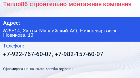 Тепло86, строительно-монтажная компания по адресу 628614, Ханты-Мансийский АО, Нижневартовск, Новикова, 13 в дальнейшем Организация, размещена в следующих категориях: