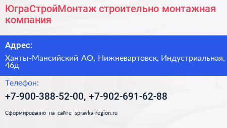 ЮграСтройМонтаж, строительно-монтажная компания по адресу Ханты-Мансийский АО, Нижневартовск, Индустриальная, 46д в дальнейшем Организация, размещена в следующих категориях: