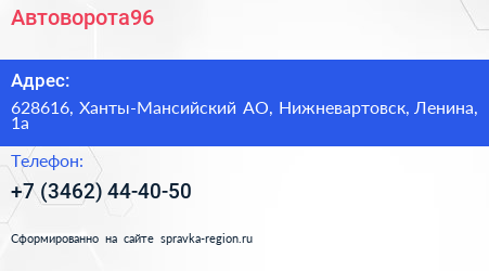 Автоворота96 по адресу 628616, Ханты-Мансийский АО, Нижневартовск, Ленина, 1а в дальнейшем Организация, размещена в следующих категориях: