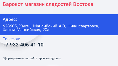 Барокот, магазин сладостей Востока по адресу 628605, Ханты-Мансийский АО, Нижневартовск, Ханты-Мансийская, 20а в дальнейшем Организация, размещена в следующих категориях: