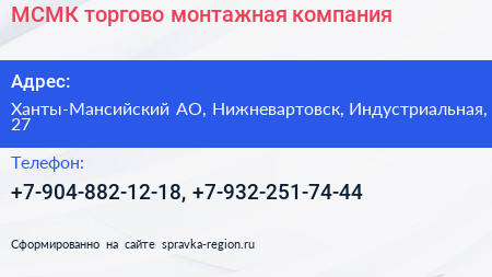 МСМК, торгово-монтажная компания по адресу Ханты-Мансийский АО, Нижневартовск, Индустриальная, 27 в дальнейшем Организация, размещена в следующих категориях: