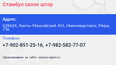 Стамбул, салон штор по адресу 628624, Ханты-Мансийский АО, Нижневартовск, Мира, 73в в дальнейшем Организация, размещена в следующих категориях: