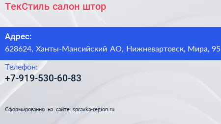 ТекСтиль, салон штор по адресу 628624, Ханты-Мансийский АО, Нижневартовск, Мира, 95 в дальнейшем Организация, размещена в следующих категориях: