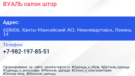 ВУАЛЬ, салон штор по адресу 628606, Ханты-Мансийский АО, Нижневартовск, Ленина, 14 в дальнейшем Организация, размещена в следующих категориях: