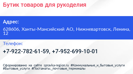 Бутик товаров для рукоделия по адресу 628606, Ханты-Мансийский АО, Нижневартовск, Ленина, 12 в дальнейшем Организация, размещена в следующих категориях: