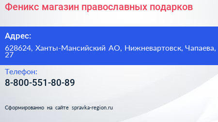 Феникс, магазин православных подарков по адресу 628624, Ханты-Мансийский АО, Нижневартовск, Чапаева, 27 в дальнейшем Организация, размещена в следующих категориях: