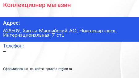 Коллекционер, магазин по адресу 628609, Ханты-Мансийский АО, Нижневартовск, Интернациональная, 7 ст1 в дальнейшем Организация, размещена в следующих категориях: