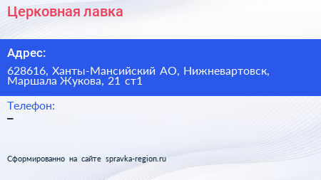 Церковная лавка по адресу 628616, Ханты-Мансийский АО, Нижневартовск, Маршала Жукова, 21 ст1 в дальнейшем Организация, размещена в следующих категориях: