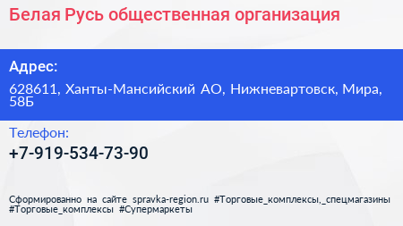 Белая Русь, общественная организация по адресу 628611, Ханты-Мансийский АО, Нижневартовск, Мира, 58Б в дальнейшем Организация, размещена в следующих категориях: