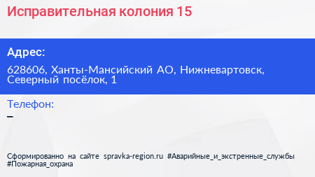 Исправительная колония №15 по адресу 628606, Ханты-Мансийский АО, Нижневартовск, Северный посёлок, 1 в дальнейшем Организация, размещена в следующих категориях: