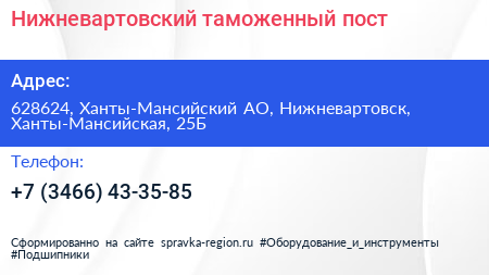 Нижневартовский таможенный пост по адресу 628624, Ханты-Мансийский АО, Нижневартовск, Ханты-Мансийская, 25Б в дальнейшем Организация, размещена в следующих категориях: