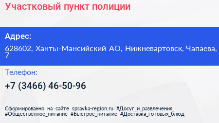 Участковый пункт полиции по адресу 628602, Ханты-Мансийский АО, Нижневартовск, Чапаева, 7 в дальнейшем Организация, размещена в следующих категориях: