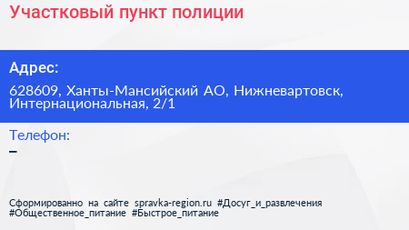 Участковый пункт полиции по адресу 628609, Ханты-Мансийский АО, Нижневартовск, Интернациональная, 2/1 в дальнейшем Организация, размещена в следующих категориях: