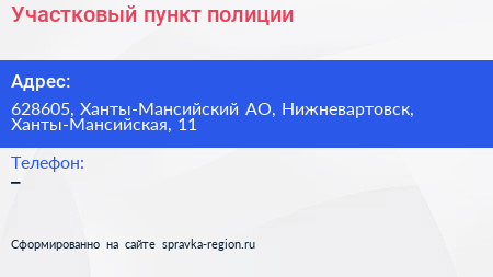 Участковый пункт полиции по адресу 628605, Ханты-Мансийский АО, Нижневартовск, Ханты-Мансийская, 11 в дальнейшем Организация, размещена в следующих категориях: