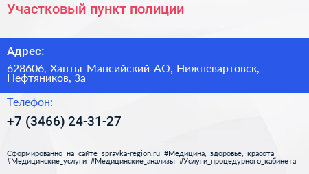 Участковый пункт полиции по адресу 628606, Ханты-Мансийский АО, Нижневартовск, Нефтяников, 3а в дальнейшем Организация, размещена в следующих категориях: