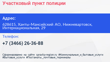 Участковый пункт полиции по адресу 628615, Ханты-Мансийский АО, Нижневартовск, Интернациональная, 29 в дальнейшем Организация, размещена в следующих категориях:
