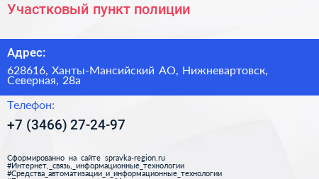 Участковый пункт полиции по адресу 628616, Ханты-Мансийский АО, Нижневартовск, Северная, 28а в дальнейшем Организация, размещена в следующих категориях:
