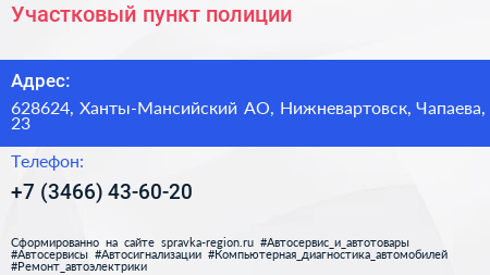 Участковый пункт полиции по адресу 628624, Ханты-Мансийский АО, Нижневартовск, Чапаева, 23 в дальнейшем Организация, размещена в следующих категориях: