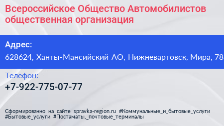 Всероссийское Общество Автомобилистов, общественная организация по адресу 628624, Ханты-Мансийский АО, Нижневартовск, Мира, 78 в дальнейшем Организация, размещена в следующих категориях: