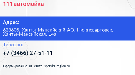 111, автомойка по адресу 628605, Ханты-Мансийский АО, Нижневартовск, Ханты-Мансийская, 14а в дальнейшем Организация, размещена в следующих категориях: