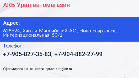 АКБ Урал, автомагазин по адресу 628624, Ханты-Мансийский АО, Нижневартовск, Интернациональная, 50/1 в дальнейшем Организация, размещена в следующих категориях: