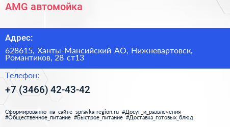 AMG, автомойка по адресу 628615, Ханты-Мансийский АО, Нижневартовск, Романтиков, 28 ст13 в дальнейшем Организация, размещена в следующих категориях: