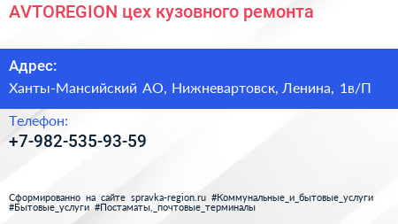 AVTOREGION, цех кузовного ремонта по адресу Ханты-Мансийский АО, Нижневартовск, Ленина, 1в/П в дальнейшем Организация, размещена в следующих категориях: