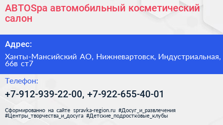 АВТОSpa, автомобильный косметический салон по адресу Ханты-Мансийский АО, Нижневартовск, Индустриальная, 66в ст7 в дальнейшем Организация, размещена в следующих категориях: