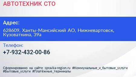 АВТОТЕХНИК, СТО по адресу 628609, Ханты-Мансийский АО, Нижневартовск, Кузоваткина, 39а в дальнейшем Организация, размещена в следующих категориях: