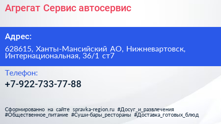 Агрегат Сервис, автосервис по адресу 628615, Ханты-Мансийский АО, Нижневартовск, Интернациональная, 36/1 ст7 в дальнейшем Организация, размещена в следующих категориях: