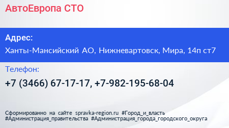 АвтоЕвропа, СТО по адресу Ханты-Мансийский АО, Нижневартовск, Мира, 14п ст7 в дальнейшем Организация, размещена в следующих категориях: