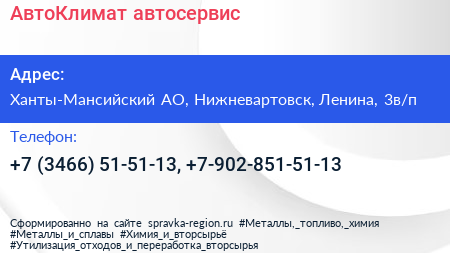 АвтоКлимат, автосервис по адресу Ханты-Мансийский АО, Нижневартовск, Ленина, 3в/п в дальнейшем Организация, размещена в следующих категориях: