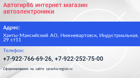 Автогир86, интернет-магазин автоэлектроники по адресу Ханты-Мансийский АО, Нижневартовск, Индустриальная, 29 ст11 в дальнейшем Организация, размещена в следующих категориях:
