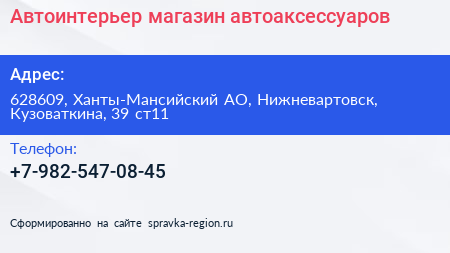 Автоинтерьер, магазин автоаксессуаров по адресу 628609, Ханты-Мансийский АО, Нижневартовск, Кузоваткина, 39 ст11 в дальнейшем Организация, размещена в следующих категориях: