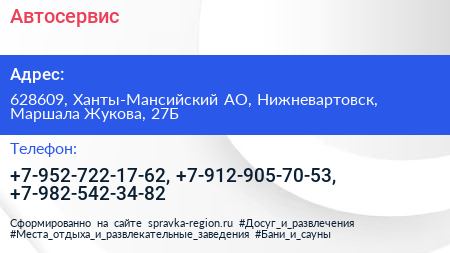 Автосервис по адресу 628609, Ханты-Мансийский АО, Нижневартовск, Маршала Жукова, 27Б в дальнейшем Организация, размещена в следующих категориях: