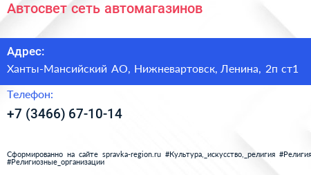 Автосвет, сеть автомагазинов по адресу Ханты-Мансийский АО, Нижневартовск, Ленина, 2п ст1 в дальнейшем Организация, размещена в следующих категориях: