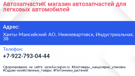 АвтозапчастиК, магазин автозапчастей для легковых автомобилей по адресу Ханты-Мансийский АО, Нижневартовск, Индустриальная, 38 в дальнейшем Организация, размещена в следующих категориях: