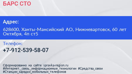 БАРС, СТО по адресу 628600, Ханты-Мансийский АО, Нижневартовск, 60 лет Октября, 4п ст5 в дальнейшем Организация, размещена в следующих категориях: