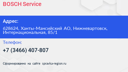 BOSCH Service по адресу 628624, Ханты-Мансийский АО, Нижневартовск, Интернациональная, 85/1 в дальнейшем Организация, размещена в следующих категориях: