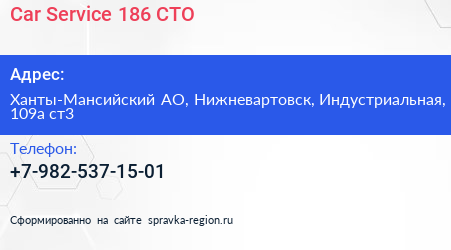 Car-Service 186, СТО по адресу Ханты-Мансийский АО, Нижневартовск, Индустриальная, 109а ст3 в дальнейшем Организация, размещена в следующих категориях: