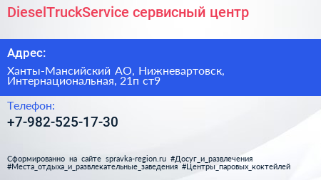 DieselTruckService, сервисный центр по адресу Ханты-Мансийский АО, Нижневартовск, Интернациональная, 21п ст9 в дальнейшем Организация, размещена в следующих категориях: